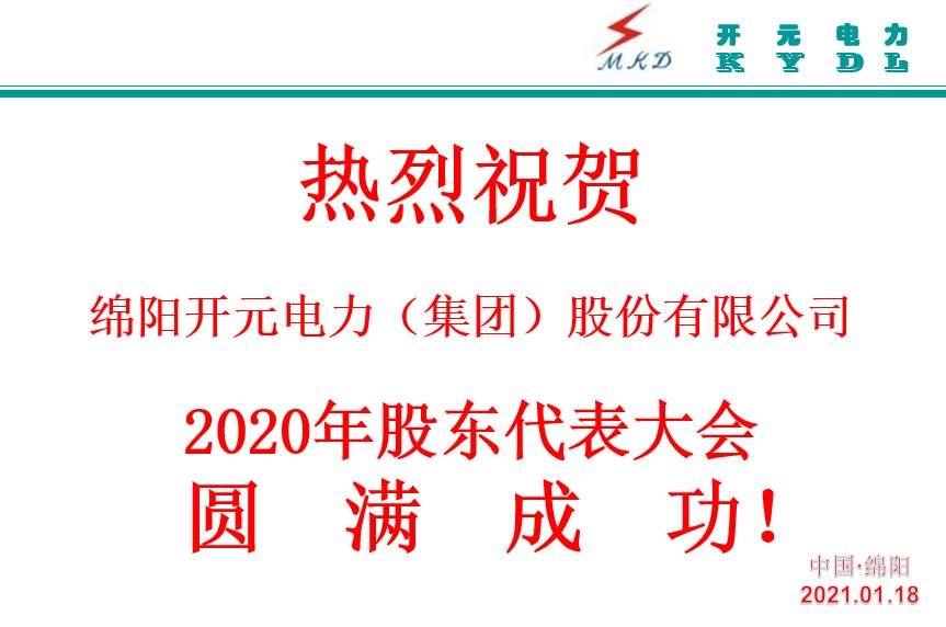 2021年1月 18日,绵阳开元电力(集团)股份有限公司2020年度股东代表大会隆重召开,会议由公司总经理姚玲女士主持。出席会议的有:公司董事会成员、监事会成员、股东代表共36人,代表公司股权 89%,经会议充分讨论,形成决...
