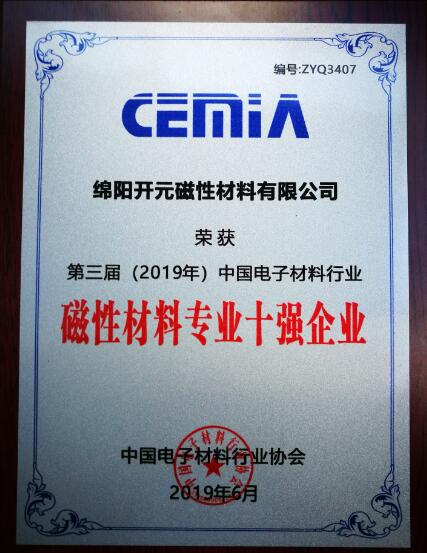 奋发图强的开元人在电子新材料和元器件行业又一次书写了壮丽的篇章,取得了经营发展中的辉煌的成就,继公司2018年7月被国家工信部评为“中国电子元器件百强企业”后2019年6月荣登”中国电子材料行业磁性材料专业十强企业“称号,这是所有开元人的骄傲,这是以又一次对开元人的鞭策和鼓励,更多的是激励我们再一次前进再一次辉煌,更重要的是体现我们绵阳工业发展良好势头和绵阳科技城建设的坚实基础。