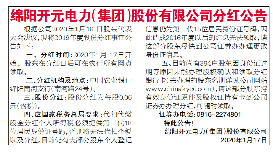 关于绵阳开元电力(集团)股份有限公司2019年度分红的公告